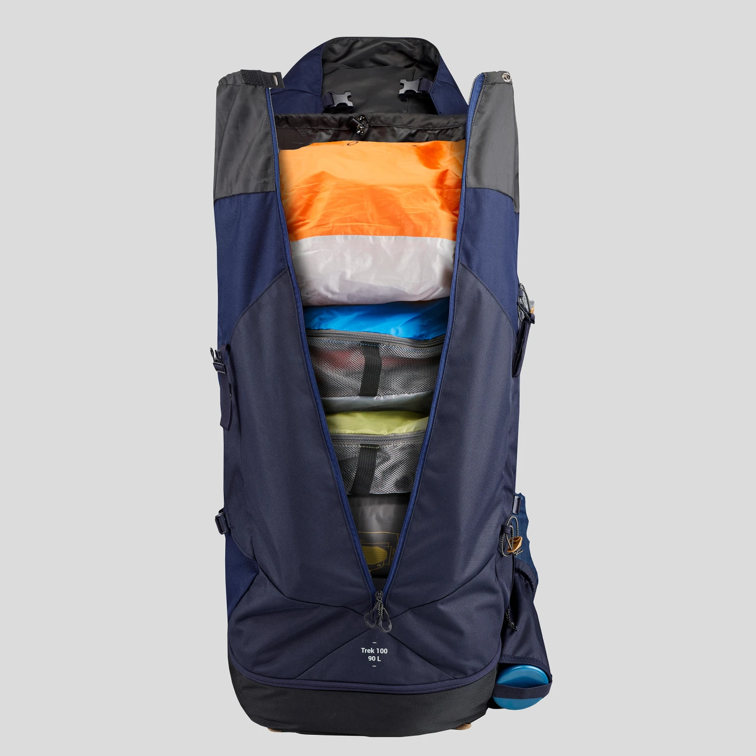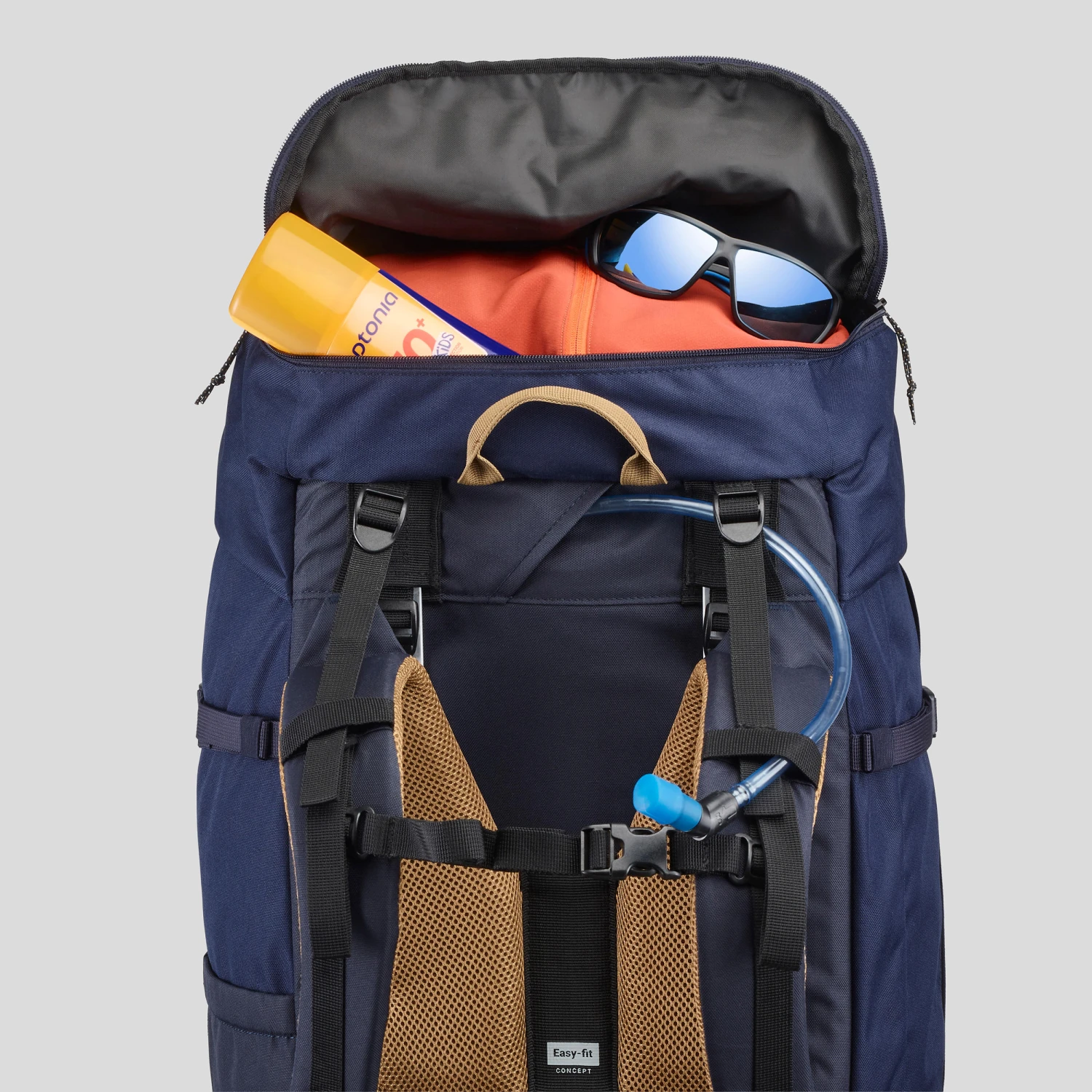 Put your bedding at the bottom. Put heavy gear (tent, camp stove, food) near your back. Store your clothing around it. A groundsheet or tent can be placed under the flap or under the bag if there isn’t room inside. Keep your waterproof jacket and fleece to hand. Place small items for daily use (sun cream, map, glasses etc.) in the pockets. The water bladder can be placed in the compartment provided down the back.